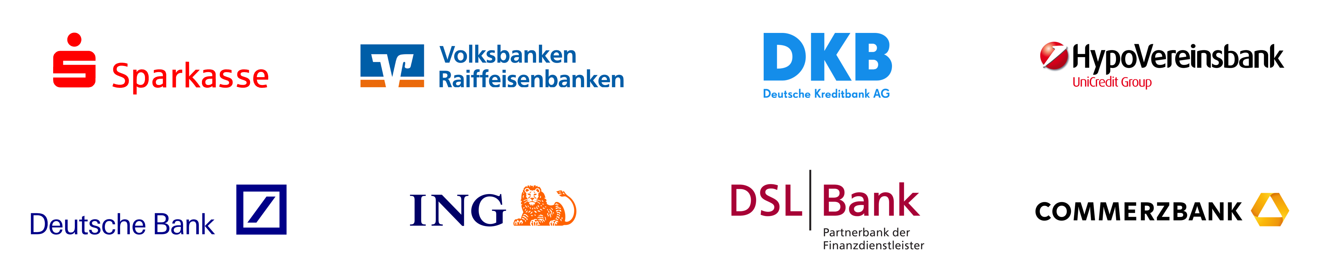 Wir arbeiten derzeit mit über 600 Banken, Sparkassen, Versicherungen und Bausparkassen zusammen, um eine maßgeschneiderte Finanzierung für Sie zu finden. Hier ein Auszug unserer Partner, auf deren Angebote wir für Sie zugreifen: